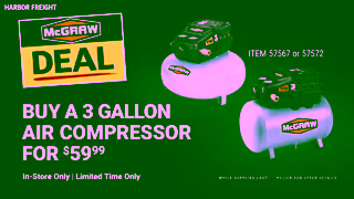 Ad Creative: McGraw Deal Buy A 3 Gallon Compressor Get An Air Inflator Or Blow Gun Free Harbor Freight